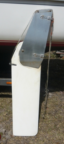 Now, the boat stays on a mooring so a slight rethink would be required if you are trailing - because the cheeks are s/s the unit is not light weight and I'm sure with a modified top to the blade it could swing up nearly vertical.