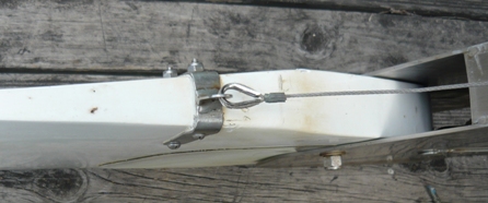 The downhaul, which is wire with a rope tail goes from the rudder head mounted clam cleat, over an exit block, down thru the cheeks (which are fabricated plate) around the curved edge of the top of the blade then into hole in the blade where a swage on the end of the wire is retained by a dished key-hole clip.