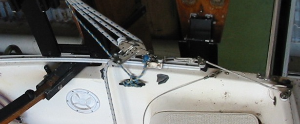 As I adjusted it for various points of sail, I thought about the far simpler transom mounted track on my Investigator. It does not even have the cords shown in your photo; instead, the central car with block attached runs only between two smaller cars, which are clipped in to holes in the track to limit the travel of the central car. It's a crude system by comparison, but it works OK.