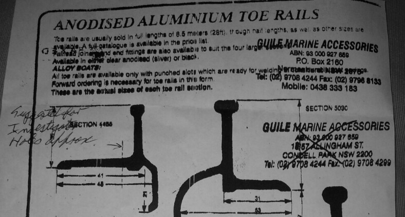 The MAN for toe rail is Alan Guile at Guile Marine Accessories in Normanhurst Sydney - yes freight may be a problem but he will have an answer.