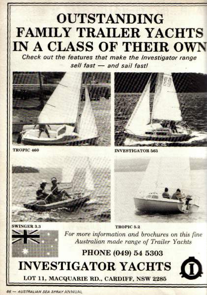 I'm not sure that the Investigators were made in several locations. As far as I am aware, the majority (the first 100 or so) were produced from one set of moulds in Sydney before the moulds were transferred to Newcastle. The first moulds were damaged by fire, I think around 1977, but were repaired. There was a set of moulds in WA but the production numbers were very low. These were the boats without the centreboard. It was more likely that the hulls were finished by several other retailers to their own specifications. There isn't a lot of information about the company but below is what I have been able to glean over the years. I am happy to be corrected, or to have additional information added to this timeline.