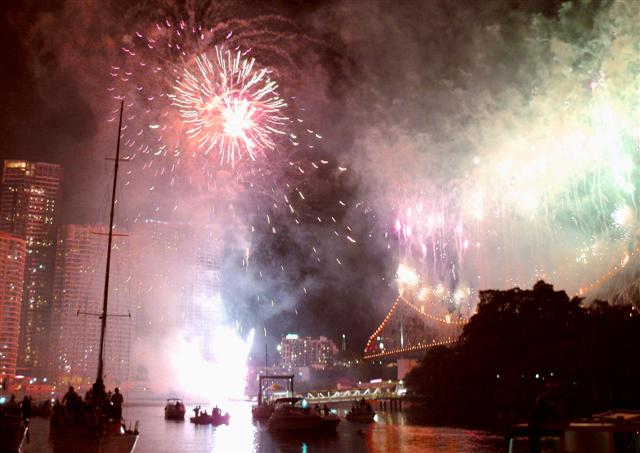 Anchored near the Story Bridge (best spot) and not only had a great view of the fireworks but the F111 dump and burn, as well as the Roulettes right over the boat.