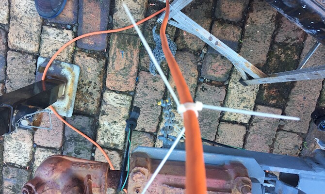 My mast wire, for those wondering is the cord of an old Flymo electric mower I used to own. These are perfect for the job as they are well sealed, only two core, round to go through holes and slightly thinner than a standard electrical lead. Flymos used to come with a specific cord with a special plug on the end. Why :?: so that Darwin Award Candidates could not use an unearthed extension lead to run their welders. :shock: Although I’m sure many of them got round that issue after the mower died. :o