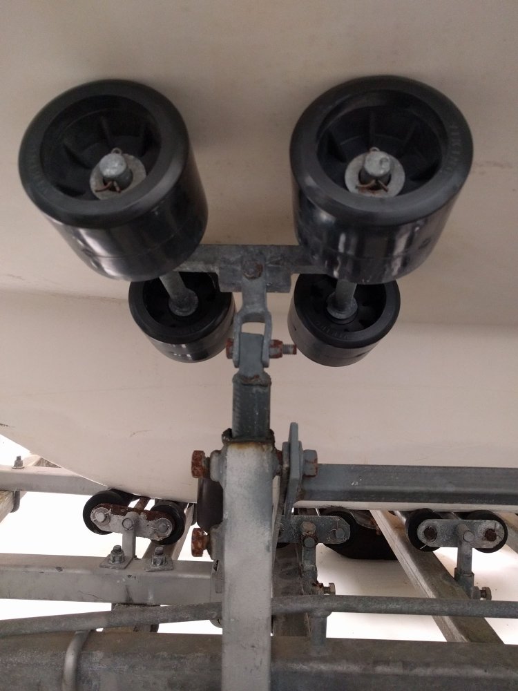 As requested, here is a photo of my quad roller setup. I replaced the skids about five years ago and haven't noticed any ill affects on the hull. The way I have them set up, there is no weight on the rollers, they just prevent the hull from tipping when you walk around on the deck. The full weight of the hull is on the keel rollers. I don't need to adjust the rollers when I launch or retrieve the boat but I did need to adjust the brackets so that the quads didn't flop around too much when the boat was off the trailer.