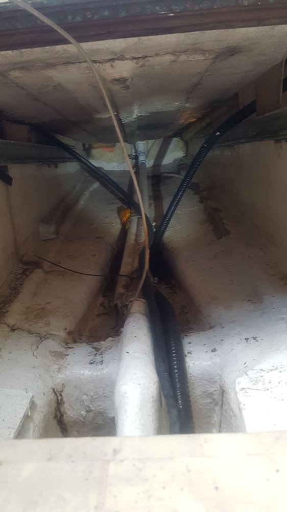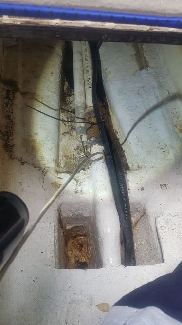 The pull cord is fully jammed, even after opening the join from the PVC conduit to the keel casing. FYI there is an adjacent PVC conduit that has a broken s/steel cable coming out of it. FYI the black conduits are Bilge pump wiring & hose.