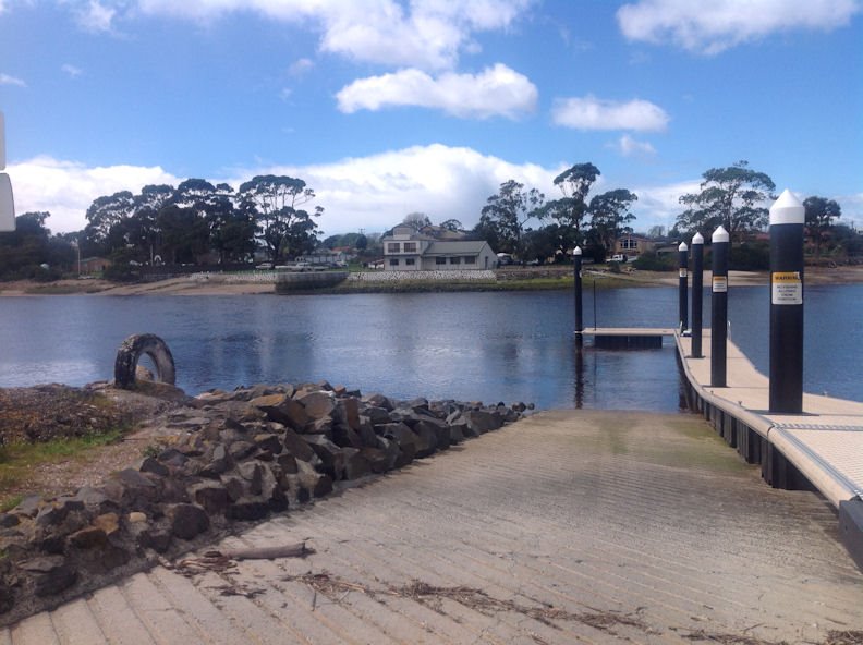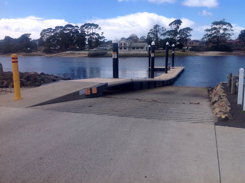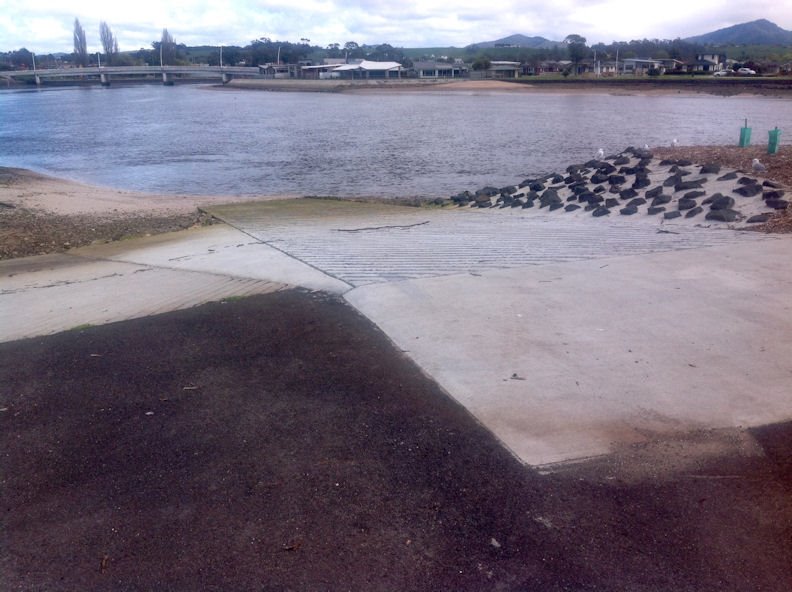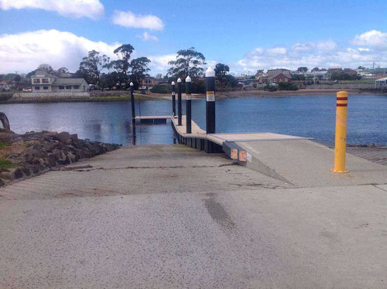 Well, Here at Ulverstone on the Leven river in Tas, there are actually 4 boat ramps. The Leven Yacht Club is situated on the eastern side of the river and there are public toilets and picnic grounds very close bye. The two ramps here are average. The other facility is on the western side of the river in a beautiful position with a double boat ramp with nice steep access to the water so you can launch and retrieve almost any time although I would be a bit cautious at dead low tide. there is a long pontoon between the two ramps with a right angle pontoon at the very end. so no matter the tidal flow direction or wind, you can launch in safety and comfort with either of these ramps. there is toilet facilities in the public stadium if it is open as well as BBQ facilities close bye as well as the NW Coast Guard Station right there. Installed by MAST, you can see where our mooring fees etc are being used. From the first and second photos you can see the yacht club over the river with the boat ramps either side of the club house.