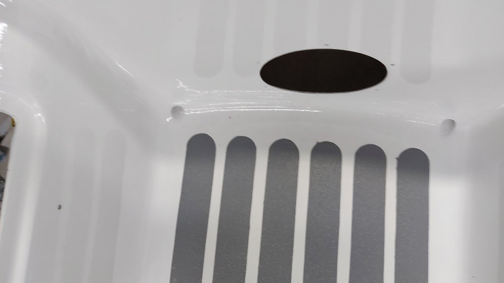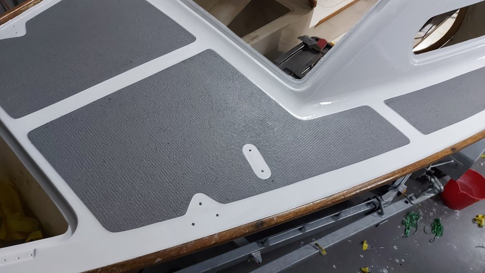 Months have passed, and in that time I have removed every conceivable fitting from the topsides and cabin, effected many gel coat cracks repairs, especially around the bottom curves to the cockpit sole and fibreglass repairs to where the cockpit drain meet the cockpit floor. These had previously leaked Like a cive because someone in their infinite wisdom tried to repair them with silastic. Anyway, another thing I have done is where the staunchans and other fittings mount to the deck where some or all of the fittings were mounted on the non skid sectiona, I shaped appropriate areas around them and ground the non slid back to smooth so there can now no longer be a chance of water congregating around the base of those fittings and can run off easily. More photos of that later on. Then I applied two coats of Norglass Shipshape 2 pack primer with roller, sanding between coats with 320 grit wet and dry and then final sanding with 400 grit ready for the Northane paint. (I have no shares or interest in these products but I must say the finish is really something else) ,be it spray, roller or roll and tip application.