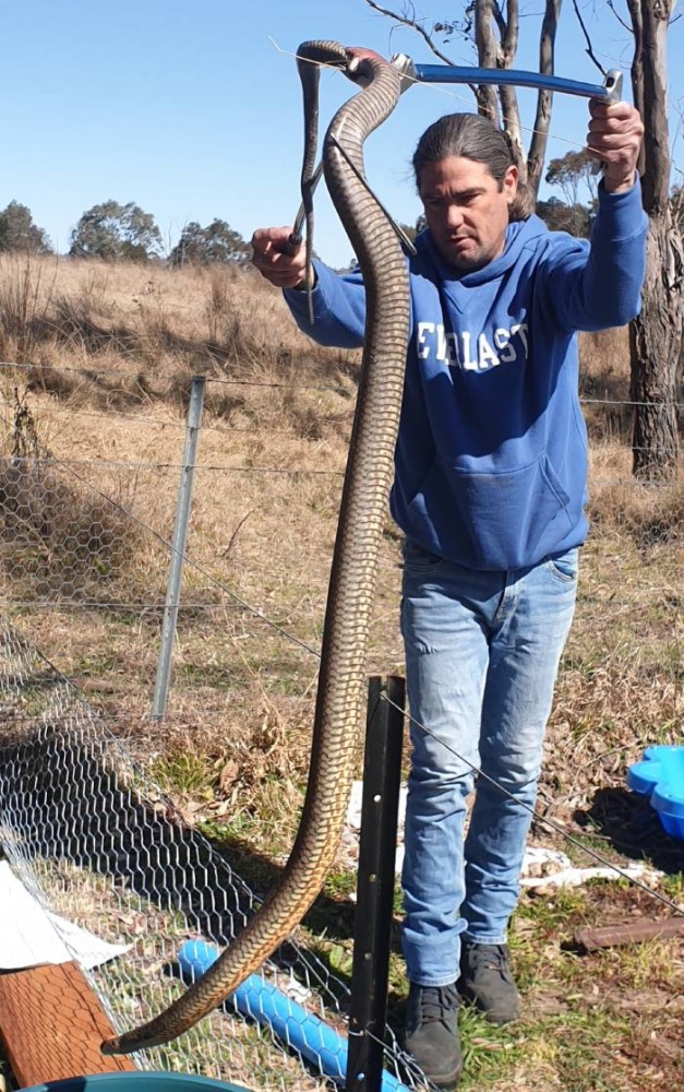 Yonks back we had a near two metre python take up a sunbathing stance of our caravan roof. I would have left him alone but he was big enough to take out Grizzlegutz our dog. So a two hour struggle with the soft end of a flat house broom (taped to the end of a two metre pool pole) ensued as I tried to gently steer him into the bush 100 m away. He didn’t come back, but we don’t leave the dog, who’s only 7kg outside on his own in summer anymore. The dog was here first.