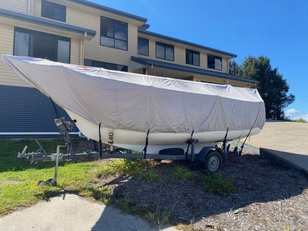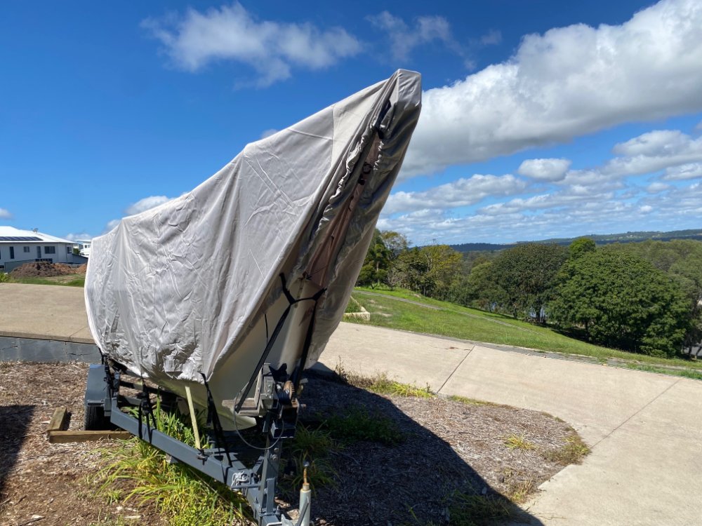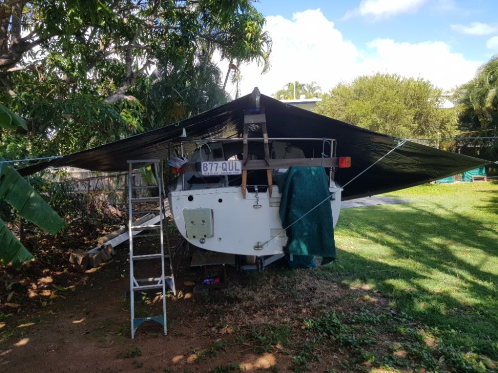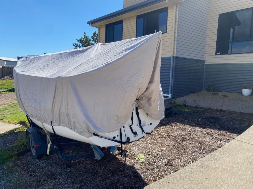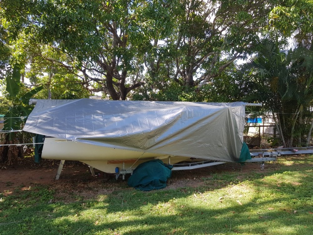 Bought a bigger one from the green shed. 20x16 foot. (4.9m×6.1m) It's heavy duty, 4 year warranty, silver top. Really covers boat well. Teria needs allot of ventilation (to stop mould growth in wet season) and access aboard for maintenance/ messin around in boat (said water rat to mole) so its guy roped out to the corner fences. Cost was $129. Have a 6ft dry work area on one side under tarp. The other side (starboard) front is guy roped to winch post and aft end guyed out to tree and backfence.