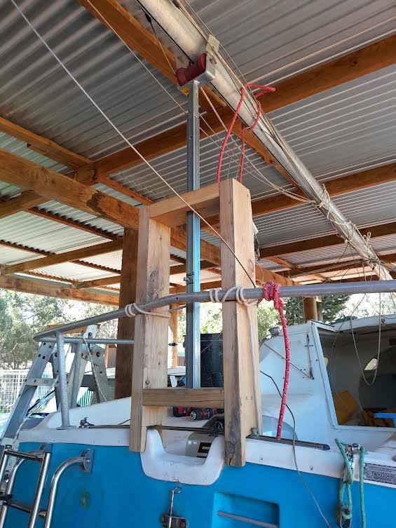 Thanks Ozzie for the reply. Still plenty to do and will post progress shots. Currently working on keel guides for the very smart, tandem axle trailer that was purchased with the boat. Have also developed a telescopic mast crutch that's easily removed once the mast is up. Not my original idea but a composite of that observed in various YouTube clips on the subject. It's ultra stable yet doesn't require anything to be permanently bolted to the boat itself (Pic attached.)