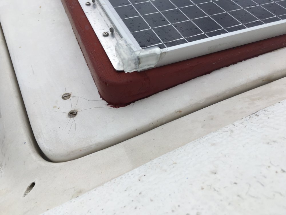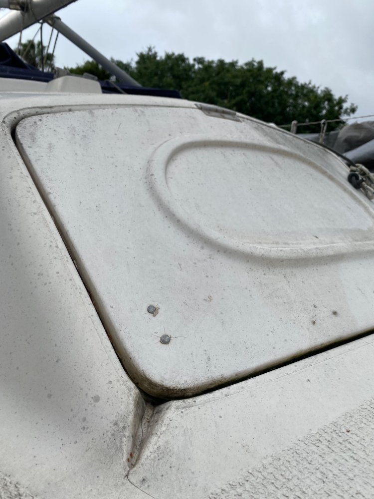 drain hole. I recently went and looked at Private Eyes in Launceston for a prospective purchaser and I noticed this little drain hole but it was only on one side of the boat. I believe it is designed to be a drain for any water that gets into the fibreglass moulding around the edge of the hatch. I spoke to David about this and he said that there should be one on each side on the deck at each front corner of the hatch. I could only find one on Private Eyes and mine has none at all.