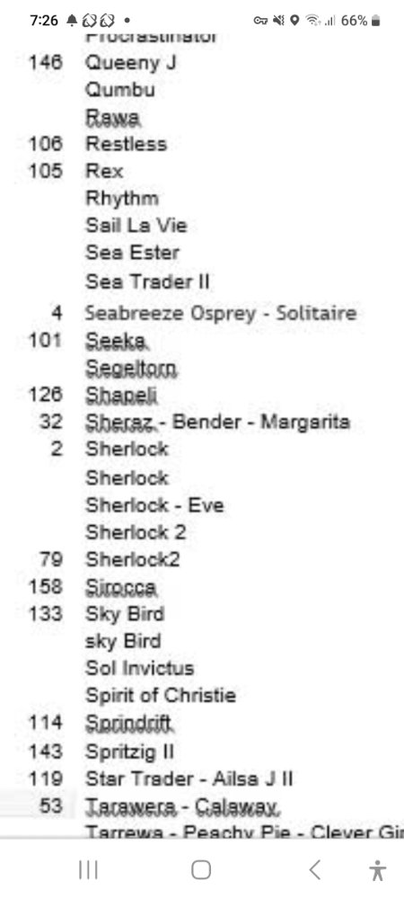 Hi Ray, I may be wrong with the way my boat is listed mate but mine is 114 which was originally "Spindrift" but it is now called "Sail La Vie". If you look at the list as attached here it looks like Sail - La - Vie is a re named