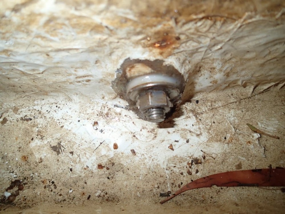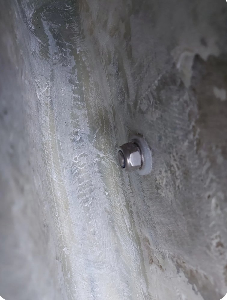 I did look very carefully at your blog. In the following image it looks like the plastic washer is half in a recess in the fibreglass, and therefore the bolt is bearing down on the washer which is in turn supported by the fibreglass.