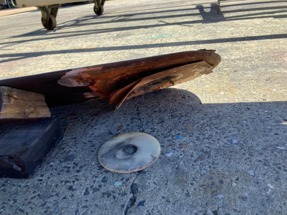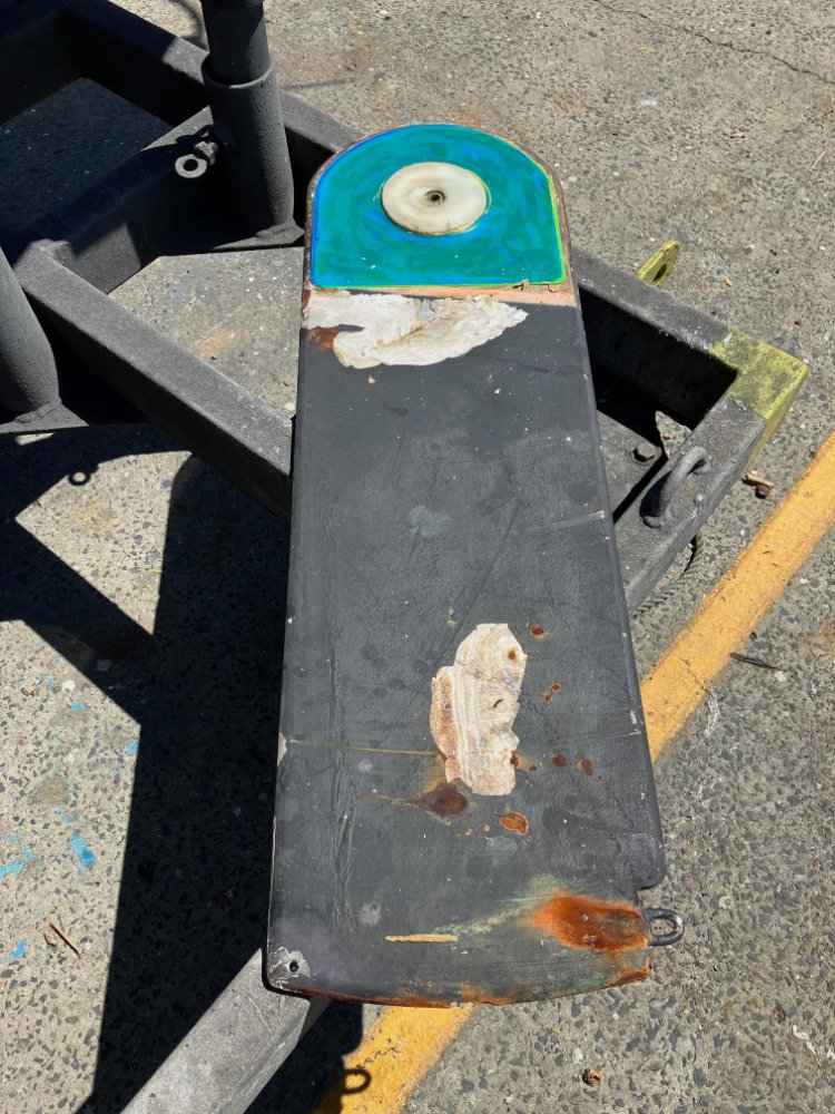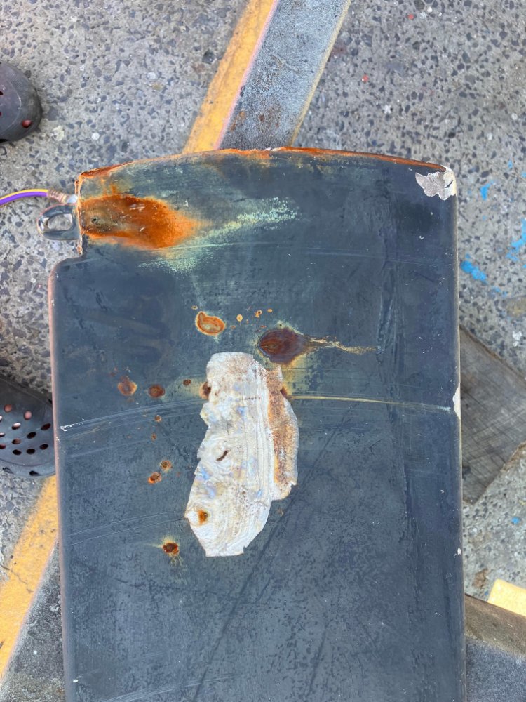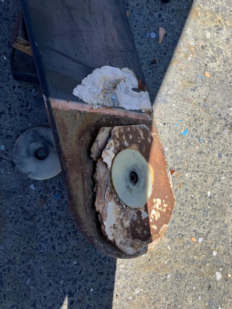 Image 1: laminex shim delaminated causing the centreboard to jam in the up position - not barnacles at all... Notice the shiny patch = bad galvanic corrosion lifting off the epoxy barrier coat.