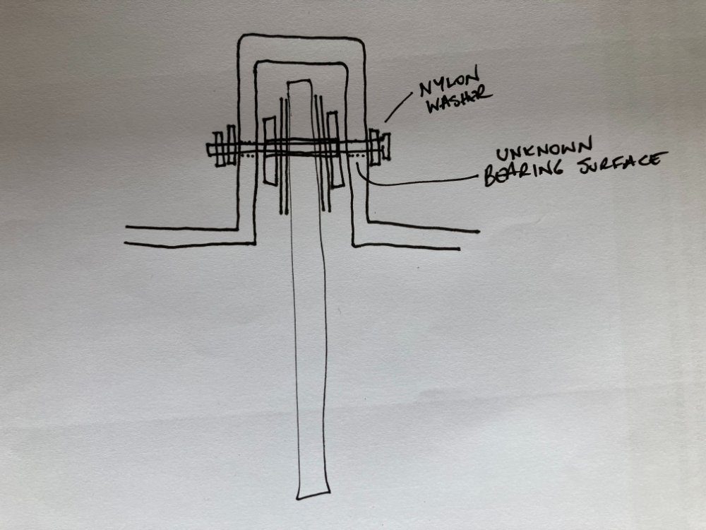 The other thing that's worrying me is the bearing surface for the bolt which appears to be just the hole in the fibreglass centreboard case. I can't understand how this hasn't become more oval shaped. Perhaps there is some kind of bearing fitted into the fibreglass. It's hard to explain and impossible to see (I need an endoscope).