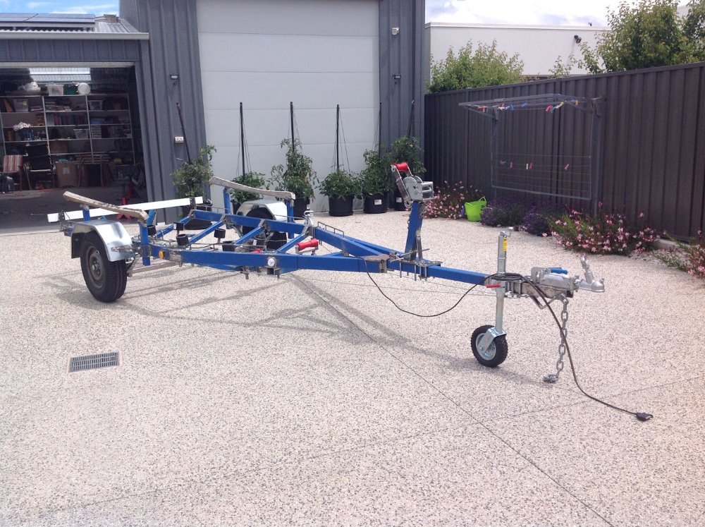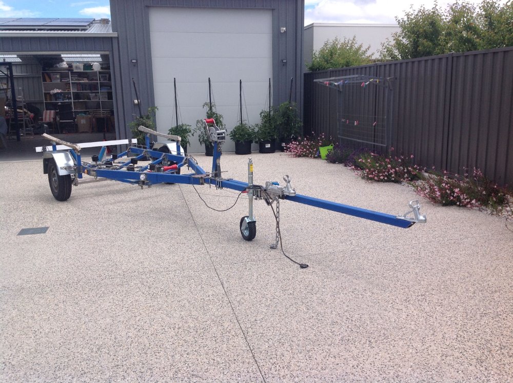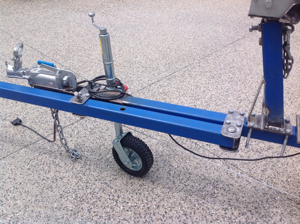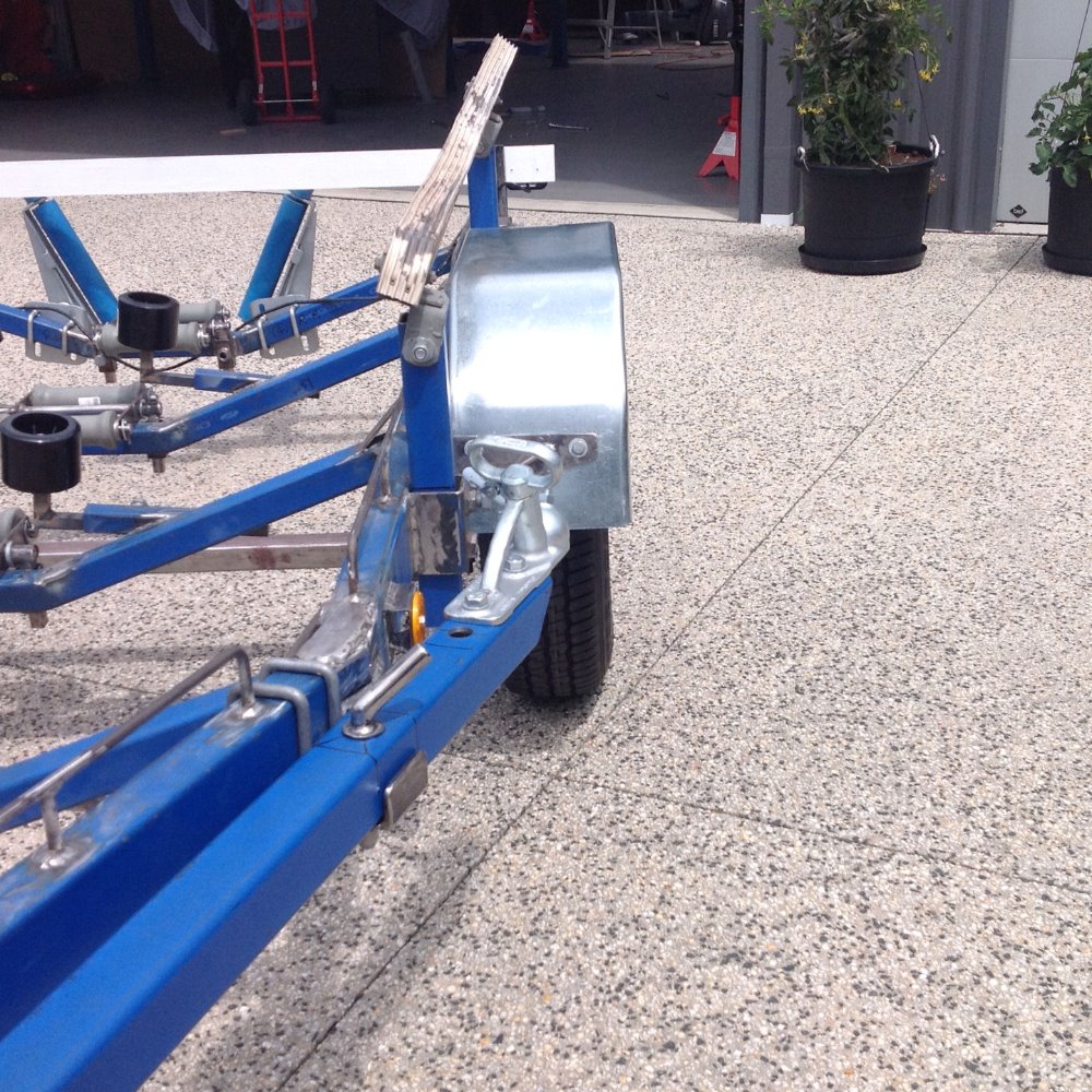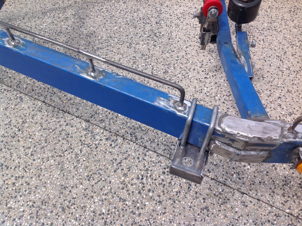 Showing without draw bar extension extended. Note how it lays against the angled side rail out of the way. With Draw bar extended Difference between extended and not extended is either 1300mm or 1500mm depending on how it is set up. I have drilled holes for both settings. Showing new winch post with draw bar extended. Note nothing interfering with the strap when winch used. Had to cut away a small area to get the winch handle to fit. Showing adjustable Keel rollers as well as centralising spring loaded rear rollers. They flatten with the shape of the hull. Bunks to be replaced at a later date. Shows pivot pin and locking pin, made from 20mm round bar using "R"clips to hold them in place I use the same locking pin to hold the extension in the "home "position. There is enough up an down movement in the pivot pin to allow you to lift the extension draw bar into its home locator Showing extension draw bar locked in home position. Note it does not protrude out past the outside edge of the mudguard Regards Peter T