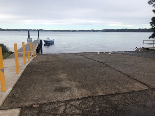 This ramp otherwise known by the locals as Croudace Bay ramp is one of the major boat ramps on East Lake Mac. Despite its heavy use for decades only recently has the council graced us with a single floating jetty . The ramp is nominally 3 lanes but normally even in peak times used as two. The adjacent shore on the opposite side to the jetty is shallow and somewhat rocky so only suitable for tinnies or similar vessels to temp anchor while parking cars, so effectively only two lanes.