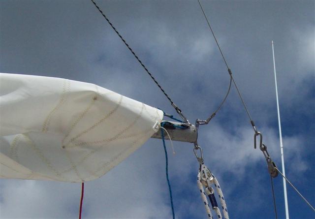 Here is a pic of the topping lift block on Yara.  The wire is 7 x 7 flexible lightweight, attached to a 4mm rope which cleats at the mast base, aft side.   I stand in the cabin to adjust.