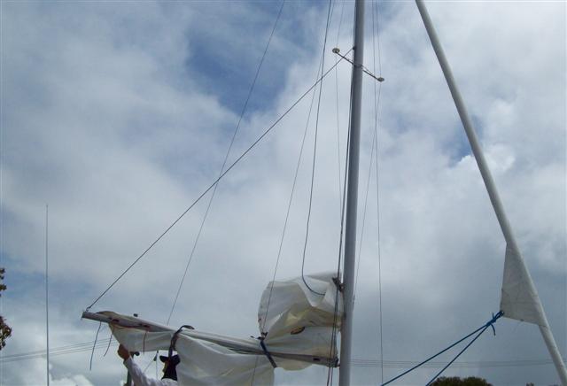 I terminate this at the mast base for simplicity and as its not needing adjustment other than during reefing its not much of a problem, even single handing. A handy thing to have though. Originally the boom just clipped to the backstay when at anchor and still do, but a TL takes a lot of strain off the backstay by supporting the weight when the boom is flopping about in rough weather.