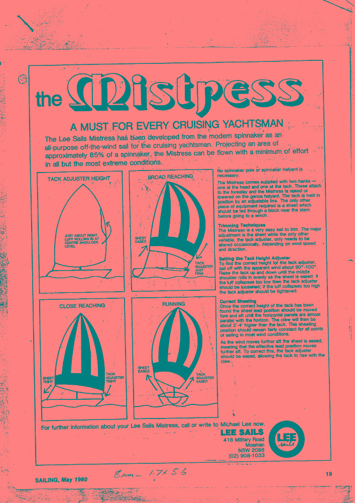 Once the correct height of the tack has been :,found the sheet lead position should be moved tore and aft until the horizontal panels are almost paralleI with the horizon. The clew will then be about 2' - 4' higher than the tack. This sheeting position should remain fairly constant for all points of sailing in. most wind conditions. As the wind moves further aft the sheet is eased, meaning that the effective lead position moves further aft. To correct this, the tack adjuster should be eased, allowing the tack to rise with the clew.
