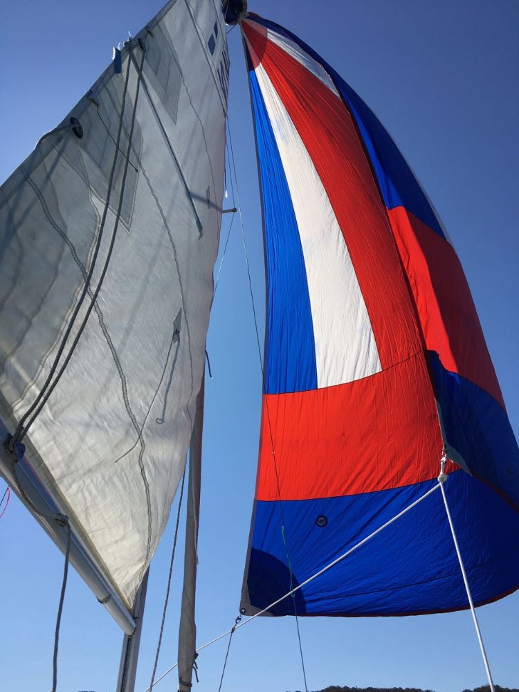My boat came with a large, light genny that I have used as such. But I wondered what it would be like run up to the top of the mast with the spinnaker halyard as a gennaker. I will be giving that a go.