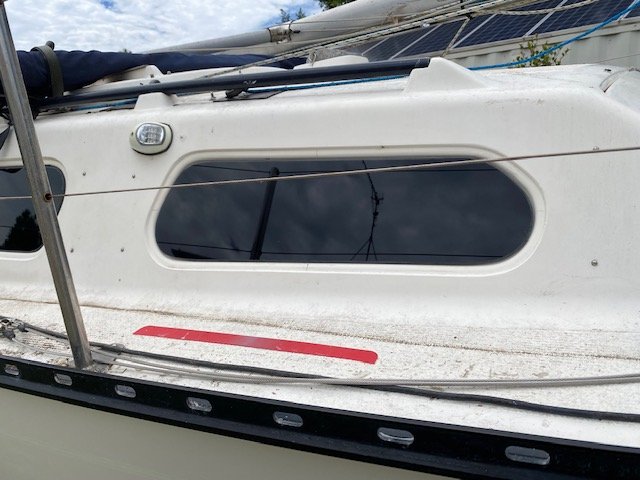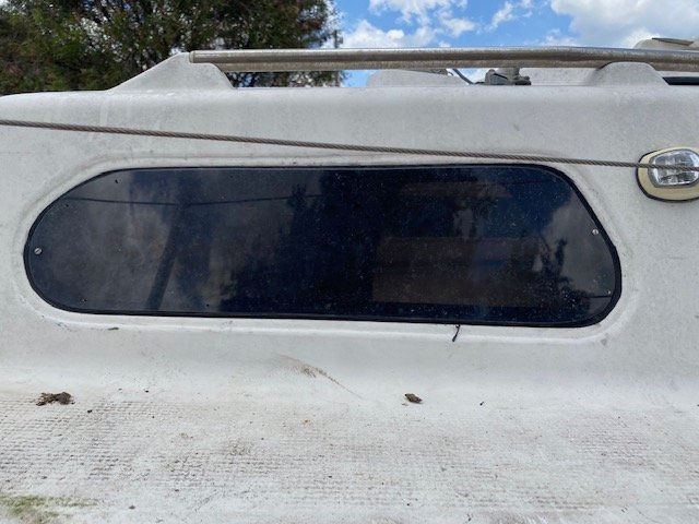 #50. Drilled out the rivets, levered out the windows and cleaned off the silicone. The bond between the silicone and the fibreglass was nowhere near as strong as between the Sika and the fg on the other boat. From there, followed Emrys tutorial. Also applied a great tip from Mark who did Aminee's windows, with regard to lining them up. The most critical thing as is continually repeated with vhb application is that you have to line up right the first time. Marks suggestion of making a mark on boat and window at all 4 points - top, bottom and both ends, was a huge help.