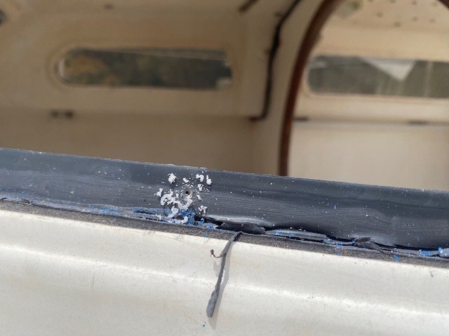 #111. Drilled through all the boat window frame screw holes into the perspex from the inside with an undersize drill. Put foam tape around the inside of the windows against the frame to block the Sika coming through later. Removed the windows. These had been fitted new about 10 years I think (gleaned from posts on the forum). As said, the Sika-like product has sprung in some places from the perspex as not screwed all round. But it was like concrete against the fibreglass. Took some work to get off.
