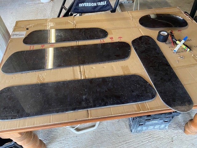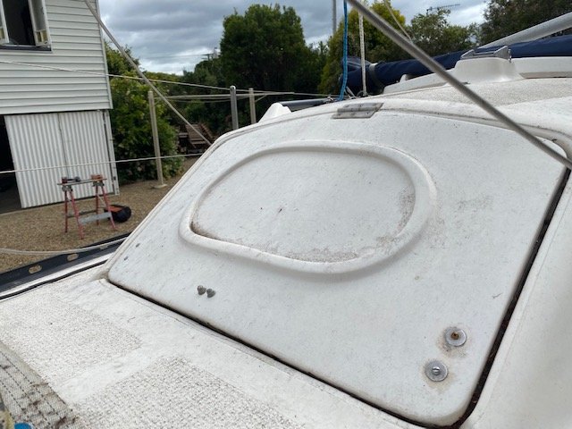 While I had them off I traced them onto my new perspex sheet and cut them out with a jigsaw. The cutting was heaps easier than I expected. I also cut one for the fore hatch. Because it was shaped, convex, I measured with a dressmakers tape, traced the window, then pretty much freehanded the outline larger to match the measurements.