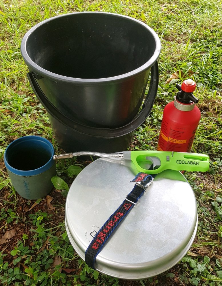Then the 9L black heavy duty B's bucket ($10) with kmart $3 cup. It uses about 1/3 the water, one or 2 cups (strategically pour into hair) enough to wet down body for soaping. Only one pot needed for hot water. It's about 10x faster to set up. The 9L bucket is smaller than the usual bucket (12L?) and stows far easier in the locker.