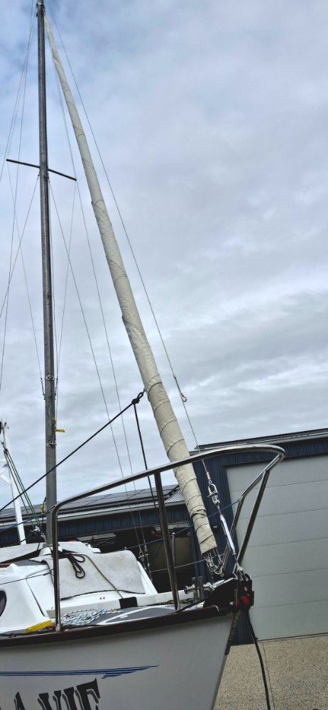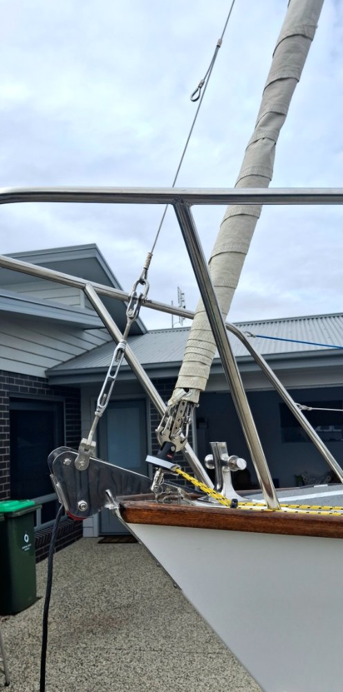 Got the new Bow roller and Ronstan Series 60 Furler fitted. Also, I have replaced all the standard rigging which has included adding a set of lower side stays as well as a 2nd Forestay. This prevents the necessity to rely on the swivel of the furler to hold up the mast. Also makes it a lot easier to attach both forestays.
