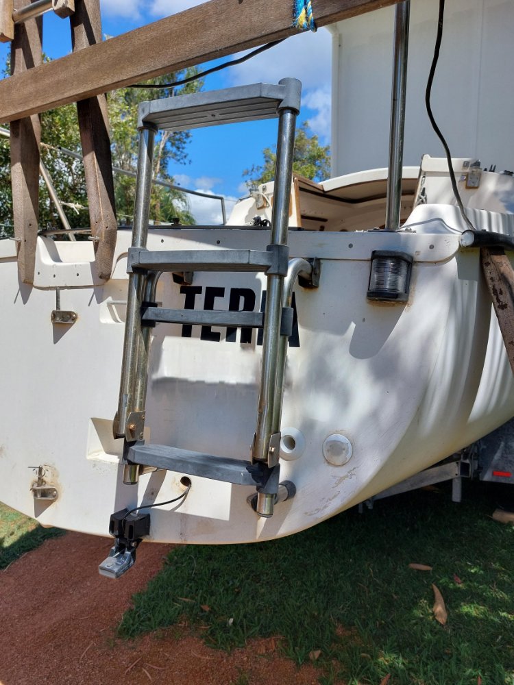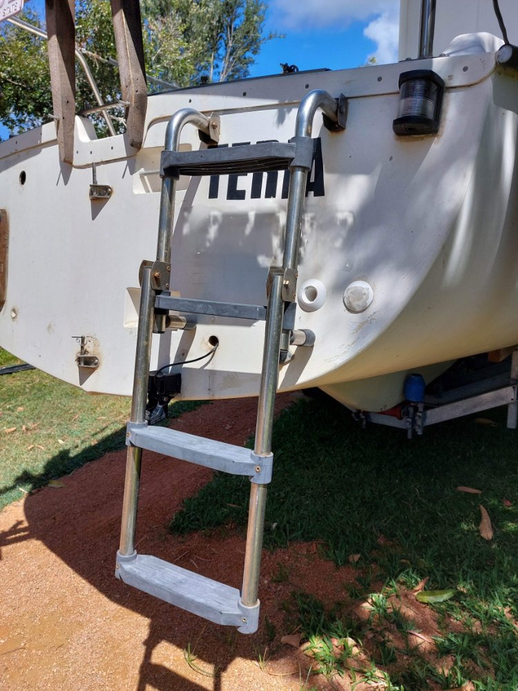 Photos atached are Teria's boarding ladder, assume it's a standard type. It works well either ashore or afloat. If its folded up, it can be lowered either from deck or from the water.