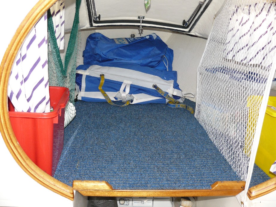 1. Removed the cushions in the forward cabin, and carpeted the area. The forward cabin is now reserved for storage etc., In the pic you'll see we added a net on the starboard side to restrain a couple of plastic crates with our tucker and other goodies. This arrangement means that you can get the clutter out of the main cabin (living) area, and have ready access to everything including the head. We found that this works very well. Talking to Robert B he has done something similar.