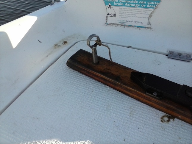 Tiller pic. The toothed rope jammer I have the velcro extension holder on is the hold down for my other wooden pivot rudder.