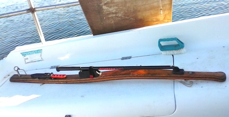 This has a Velcro tab to lock it down to the tiller when not in use (important) behind that I have a basic bias serrated / smooth knife in a solid clip in scabbard. This will cut rope and spectra. ( I don't race but this is a requirement in some race rules, possibly all )