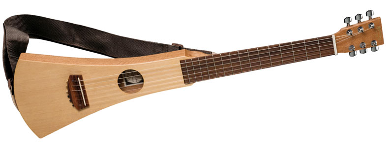 Has a full size neck but a very slim body , best played with a strap or resting on a pillow but can be played low on your knee. A fairly rigid top because of the small size so not much volume but thats not its purpose. It will be fine for a few blues and ballads on the mooring or round the fire when camped in the van. It needs a new set of strings so Im putting a set of ultralight acoustics on, which will quieten it down even more, but it wont annoy the neighbours in the mooring zone.