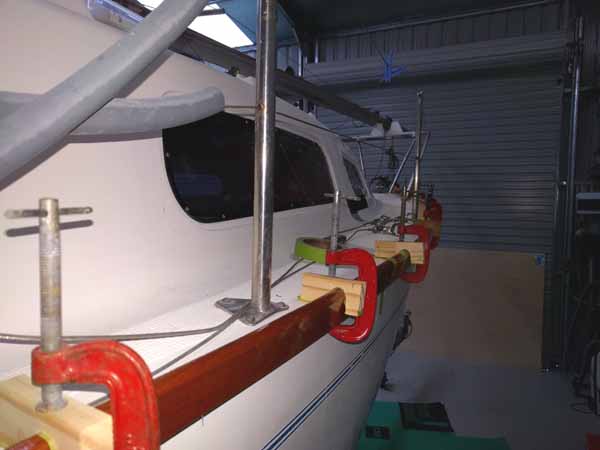 Pacific Maple is a soft timber and it was no problem to machine the toerails to the profile. I used a 6m plank to support the timber when using the router. The Cabot’s maple varnish worked well on the timber. The rail was fitted to the boat using only glue. My original rail had rotted where the fasteners were. I made up clamping blocks to make sure that the rail was hard against the chine for the entire length and used numerous clamps to secure it while the Epiglue hardened. Epiglue is a two pack marine adhesive that I have used before. It is expensive (the glue cost more than the timber) but is very good. Surprisingly, you can buy it from Bunnings as well as marine suppliers.