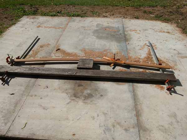 I like the look of the original wooden toerails on the investigator and wanted to duplicate these.  I think that the original wood was maple or maybe silky oak, neither of which is readily available in my area.  The problem is finding a suitable timber in the length required as the major suppliers have only shorter lengths and I didn’t want to scarf the timber.  I tracked down some 5.8m lengths of 48x19 Pacific Maple (Meranti) at a timber yard on the Tweed that would do the job.  (One trick I use when carrying long lengths of timber on roof racks is to use an extension ladder to support the overhangs.  You simple extend the ladder to the appropriate length and it provides a rigid platform to tie to.) I purchased three lengths (in case I stuffed one up) for a very reasonable $60.