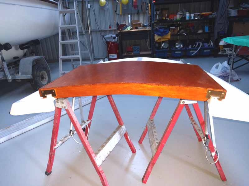 The next job was to replace the woodwork. The timber under the mainsail traveller had deteriorated and I tackled this first. I have seen picture of Investigators where the traveller is secured directly to the fibreglass but I opted to replace the wood. The original pieces were capped either side in ply but I simply used solid hardwood for the replacements. You need to be double jointed to get at the bolts holding these down but it is possible with a bit of persistence. I decided to try Cabot’s exterior varnish stain (maple) for the timber finish. This product is water based and drying time is only two hours. It certainly is easy to use and looks the part, but only time will tell how well it will stand up to the elements. I bedded the new wood down using black Sikaflex 291. Here a couple of pictures to show the progress.