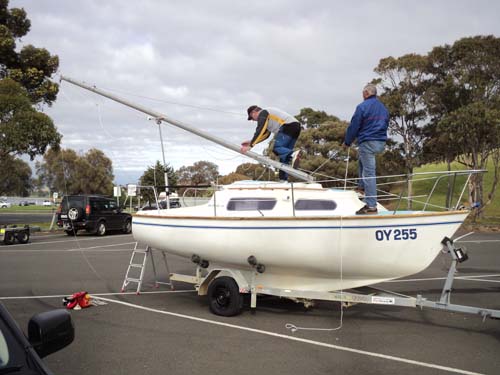 With assistance from a good friend Jim, who has many more years experience with trailer sailers than me, we hoisted the mast in the carpark at St Helen's Marina (North Geelong), from where our club (the Geelong Trailable Yacht Club) sails every second Sunday.