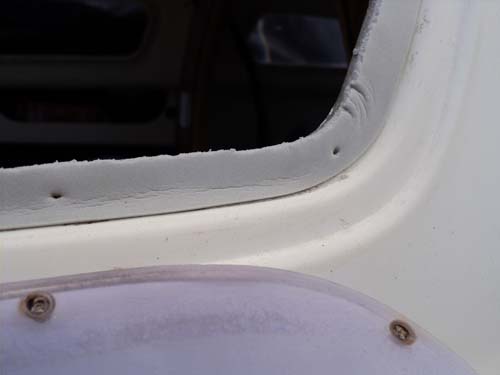 All the (tinted plexiglass) windows on my boat were original when I got her, with all of them screw mounted into some sort of black rubber sealant. When new, I imagine this sealant would have been a pliable spongy black rubber strip, but after 30 odd years it had dried out and shrunk, leaving ample opportunity for water to enter the cabin and wet my carpet and cushions. And after just a day or so, that leads to that horrible wet smell and black mold spores. Yuk!