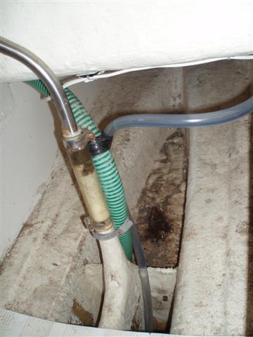 This is the area under the step. Wooden rails support the slide out stowage bucket. The clear hose is the water hose leading to a pump in the port cockpit locker. The reinforced hose is the bilge pump suction leading to the bilge pump in the starboard cockpit locker.