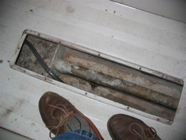 This is a view looking from under the V berth aft. The pipe is our water pipe from the tank which is stowed in the forward V. The whitish block is part of the glassed in lead ballast. The other object is a cockroach bait. The step is the one under the porta pottie which you can see in the previous photo.