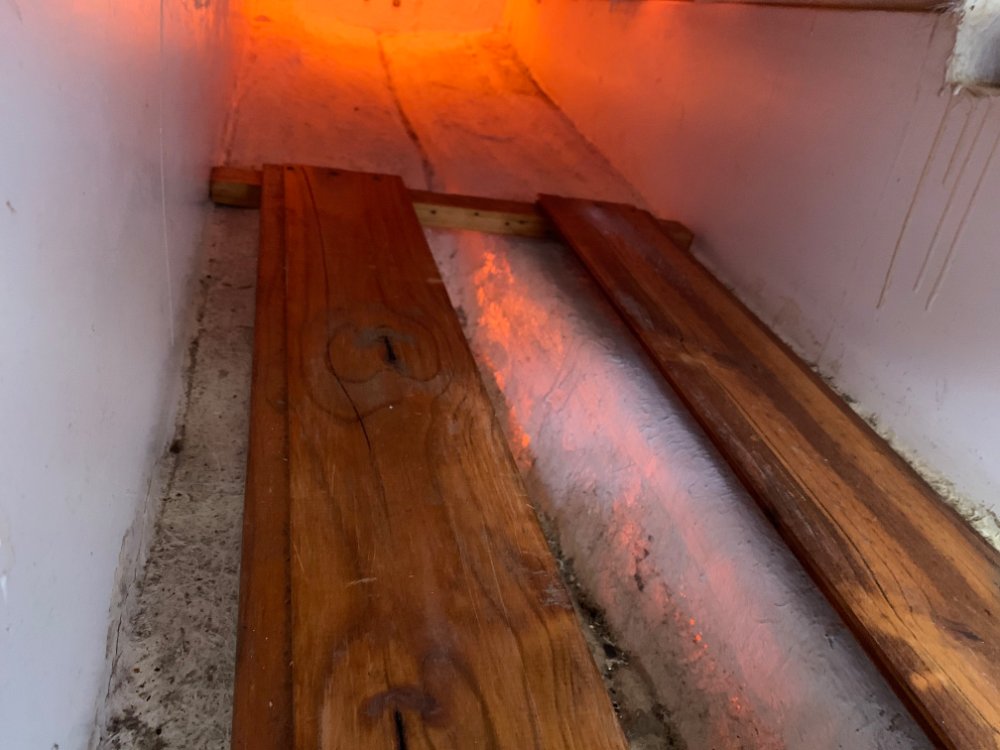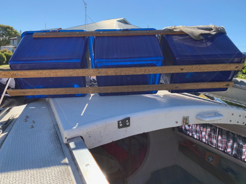 This is how Ian had them set up on my boat when I bought it. The timber platform is very light and simple, all pine. The 2 long bits are only 10 mm thick and about 100mm wide. The 2 crosspieces about 12mm thick. A few screws and Robert's your mother's brother.