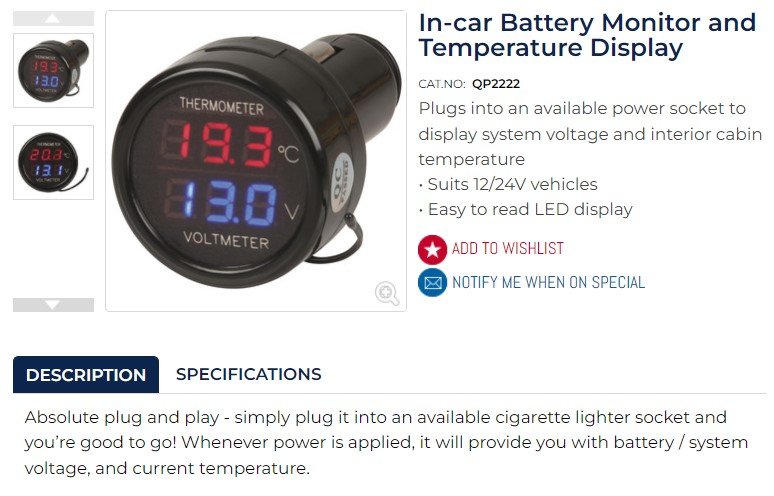 Going the KISS principle I like your first simple cig lighter volt meter Andrew. Used mine from Jaycar for years. Useful voltage/capacity chart too. I found voltages a bit of a black art.