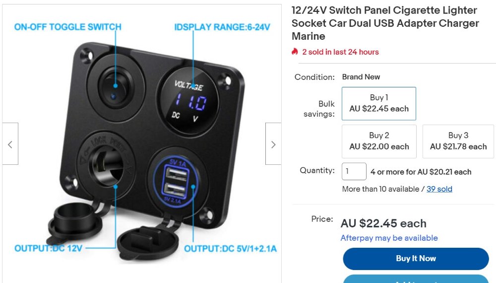 Andrew, I installed a voltage gauge which came in a housing which included a USB charging port and two cigarette outlets. I found it on ebay. The voltage display is separately switched so that it doesn't drain the battery when not required.