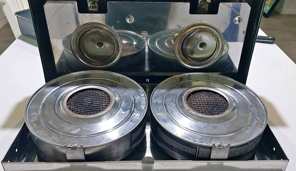 Just bought some 3mm hard neoprene mat at B's (45x45cm, for door seals) plan to try making canister seals for it. They should stop fuel evaporation when not in use. It's got monster sized fuel canisters which hold 1.2L each which run for 4.5 hrs on full or 10 hrs on low.