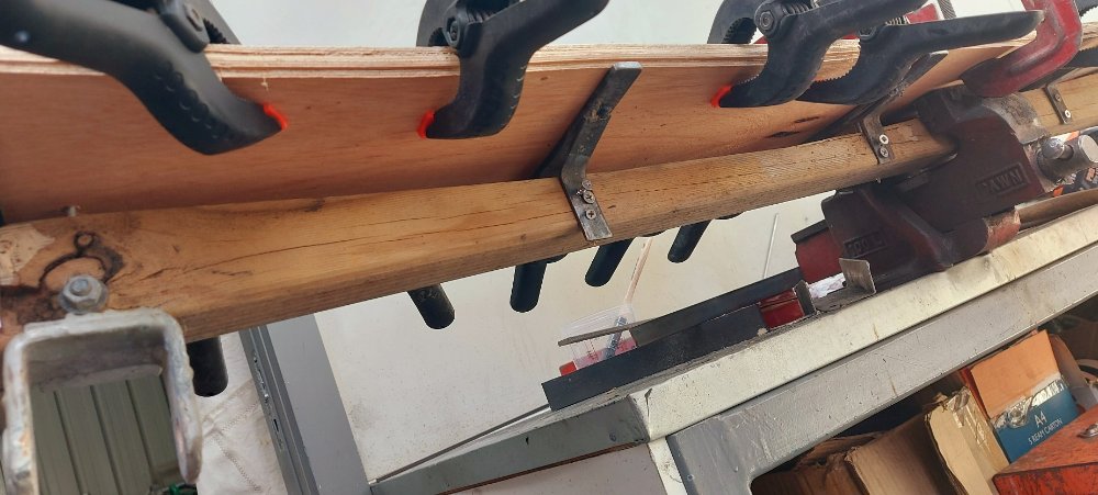 Adjusted the original bunk away from the hull far enough so I could jamb 1 thickness of ply against the hull by using wedges while I welded brackets on to the steel pieces so they could be screwed on to the old bunk.