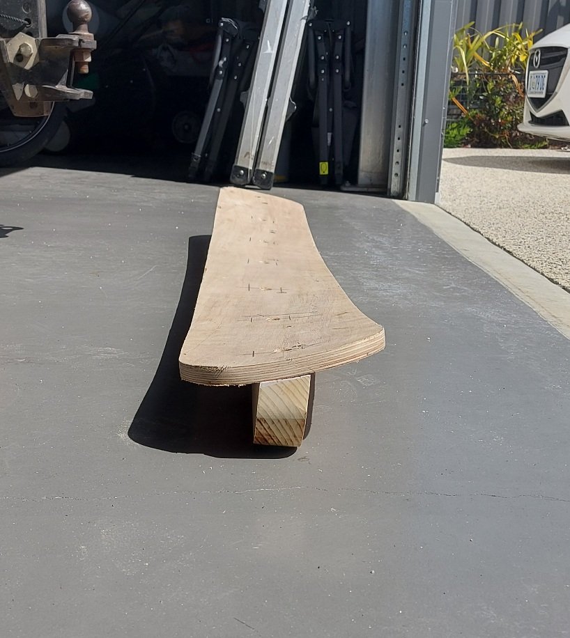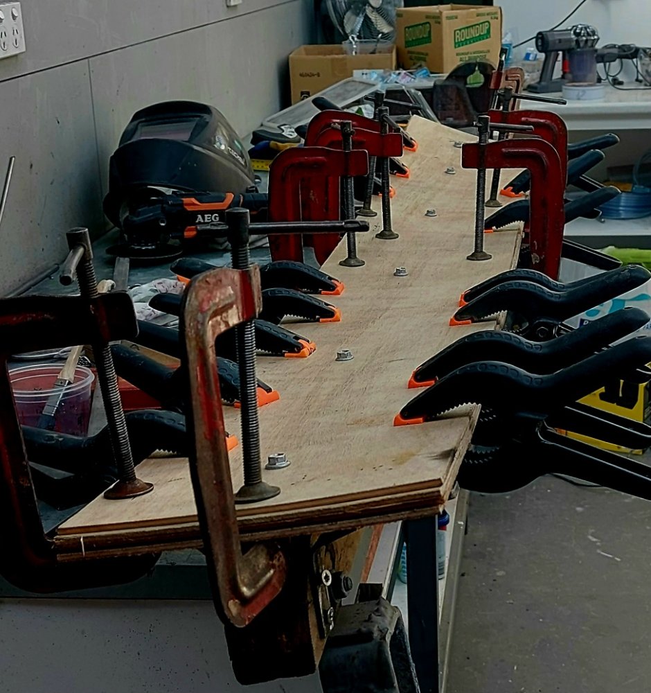 Once the whole 6 of them were done, I ended up with a former so I could laminate 4 thicknesses of the ply which ended up being the same complex curve as the hull. I used Tightbond 3 to laminate. Once the laminated plank was fully set I shaped a new beam to attach the plank to. Used Bugle screws and epoxy to put it together and then saturated all the timber with an epoxy wood sealer before painting with the same 2 pack paint I used on the boat. See below.