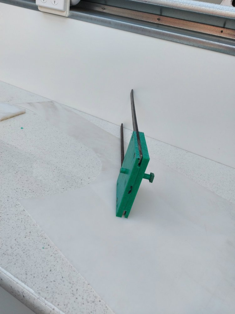 Hi Ian. Just to explain the different leading edge on my centreboard. In the past, someone had let the centreboard drop fully down without controlling its weight on the lift rope. This then let the board smash into the front edge ofvthe centreboard case causing damage. I had to do a fibreglass repair to that area and then, to prevent the same thing from happening again in the future, I installed a specially shaped block of nylon as a bump stop to the front of the centreboard case. Then, when I built my new centreboard, I made allowance for the stopper block by cutting away some of the leading edge of the centreboard.