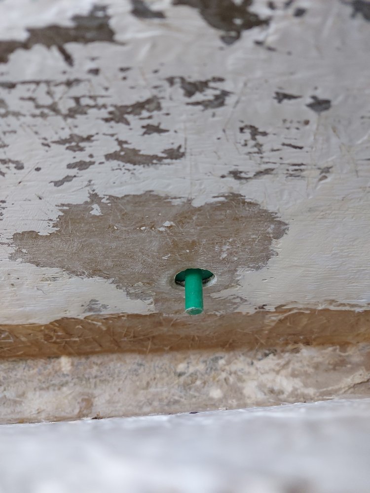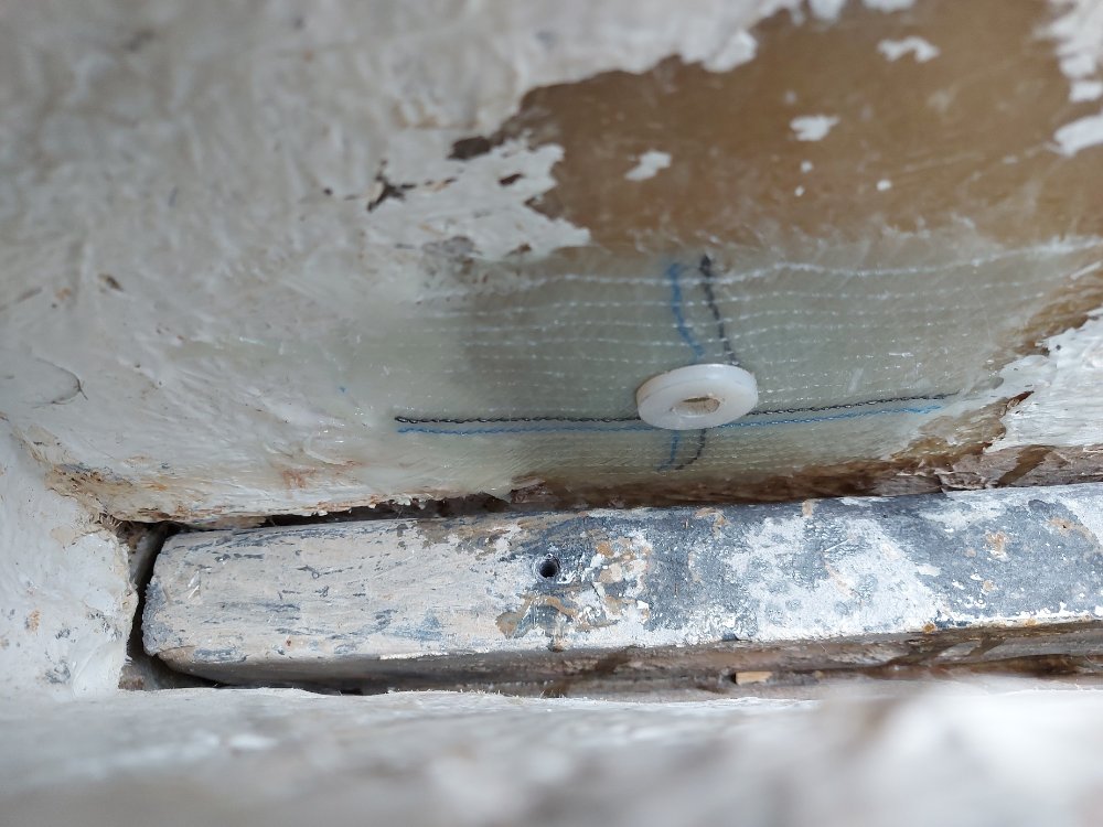 It looks like Andrew's nylon washer is half buried in the fibreglass and Peter's nylon washer is sitting on top of the fibreglass. I hope to find time this weekend to clean up around the bolt and figure out what to do.